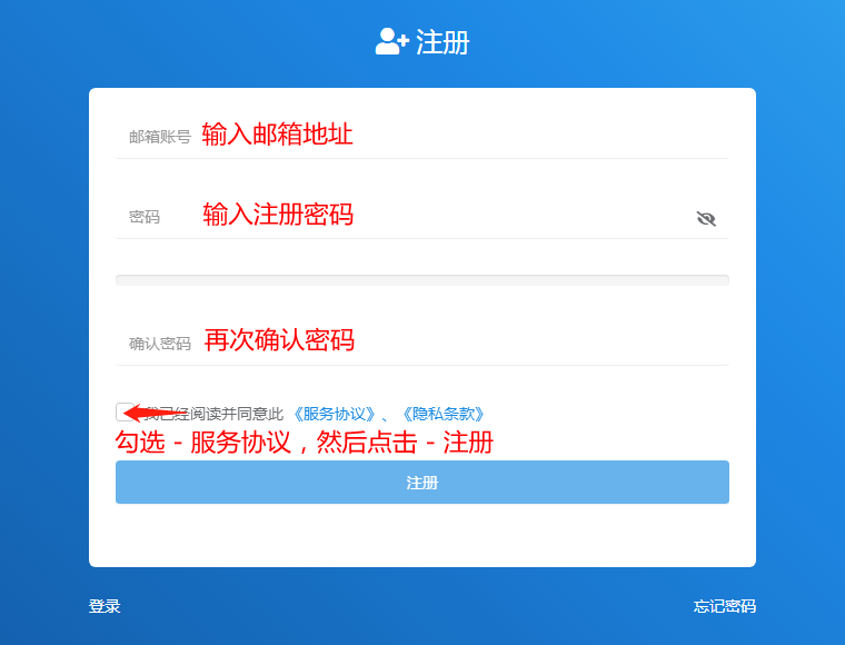 在注册页面输入邮箱,和易记的密码,勾选服务协议,点击-注册即可!