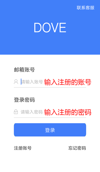 第2步:运行APP后,输入:您注册的DOVE邮箱账号和密码,点击 - 登录(如图)