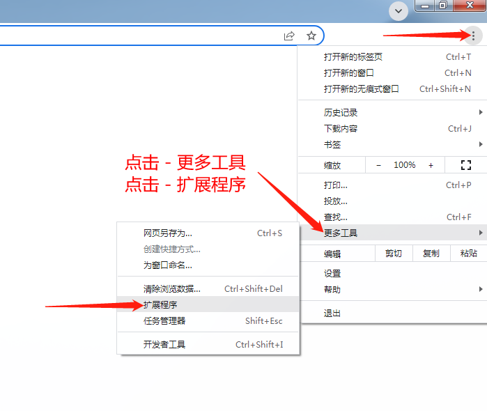 第2步:点击 Chrome 浏览器点击右上角三个点 - 更多工具 - 扩展程序