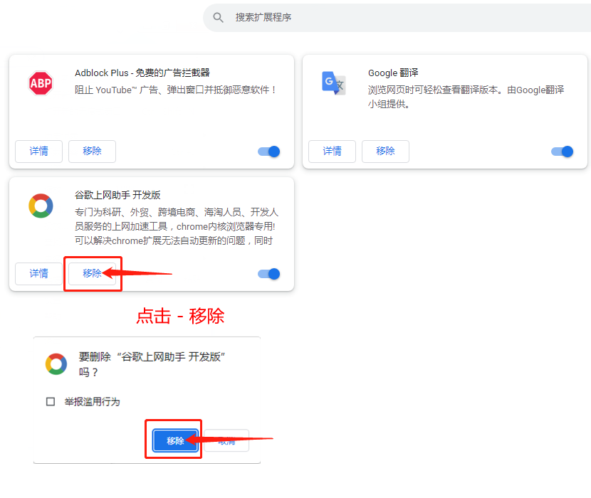 第1步:很多常见的浏览器插件:如谷歌上网助手,它会阻拦DOVE的使用,如何自检并解决: