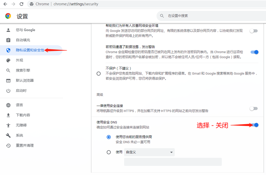 第1步:打开 Chrome 浏览器点击右上角三个点 - 设置 - 隐私设置和安全性 - 安全 - 使用安全DNS