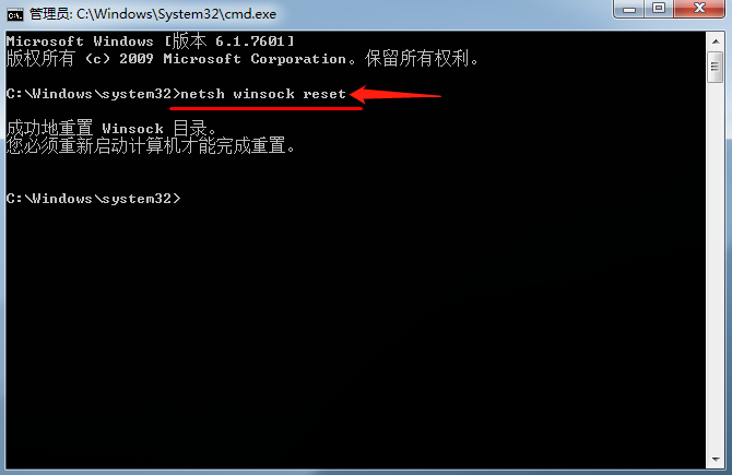 第4步:在DOS窗口中输入:netsh winsock reset 然后按回车,执行命令