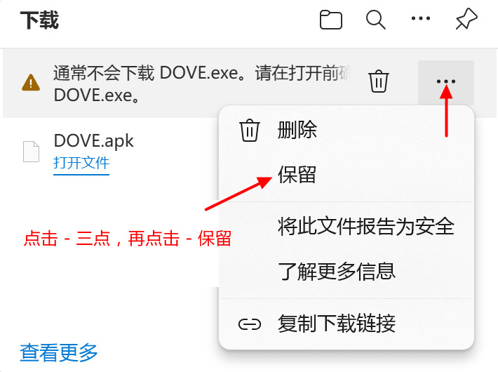 注意:如浏览器阻拦下载,请按图点击 - 三点,再点击 - 保留