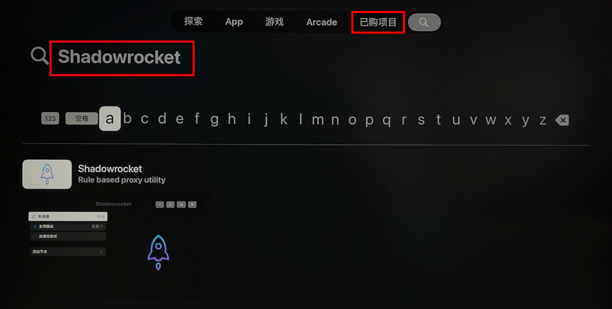 第2步 安装 Shadowrocket:打开 - Appstore,点击 - 已购项目,搜索Shadowrocket,然后下载安装Shadowrocket