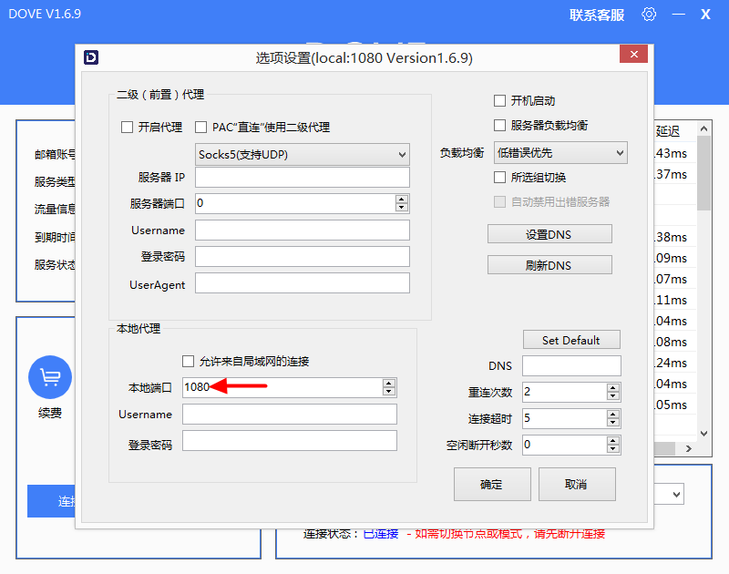 第2步:查看DOVE加速器中设置的端口,服务器默认为:127.0.0.1,端口默认为:1080