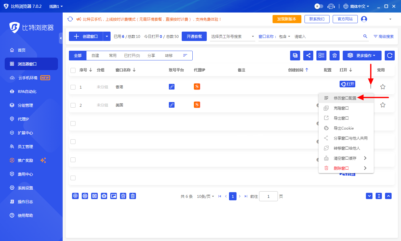 第3步:打开运行比特浏览器,选择新建窗口或是修改某个窗口配置