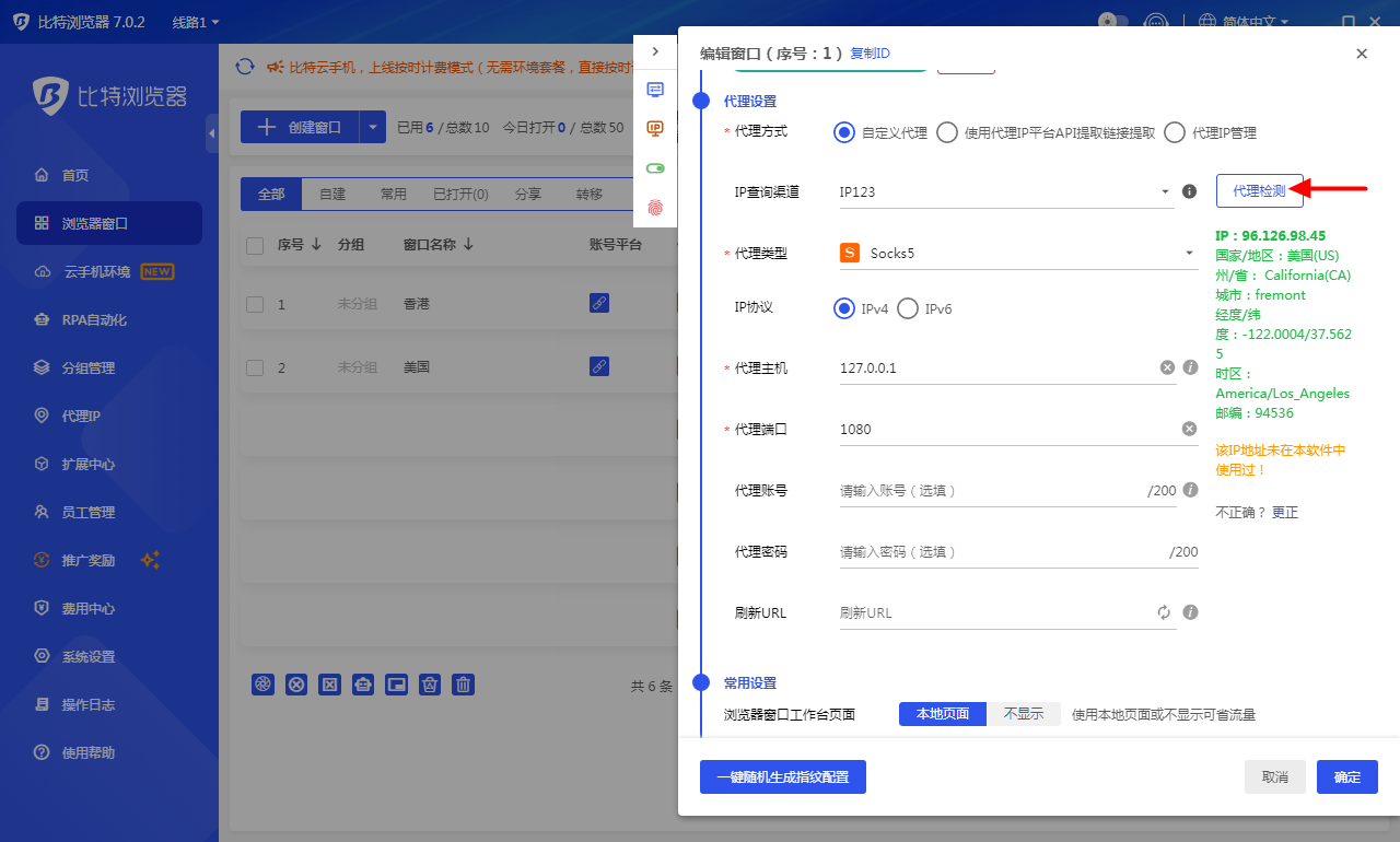第5步:点击 - 代理检测,显示的地区国家和客户端可以对应,说明设置成功,可以使用了